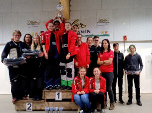 | Unsere Mannschaft (Melina Körner, Oliver und Sabrina Michelmann, Adrian Richter) erkämpfte den 2. Platz am 21.01.2017 Am Sonntag stand die Einzelwertung an. Hier erreichten in der Schüler/Jugendwertung unsere 2 Starter das Finale (wird nach der ISSF-Regel geschossen). Adrian (Jugend) platzierte sich auf dem 7. Platz. Sabrina (Schüler) kämpfte sich bis auf den 3. Platz. Unsere beiden Junioren blieben leider im Halbfinale hängen. Trotzdem war es für die Jungschützen von der SG Gottmadingen ein sehr schönes und erfolgreiches Wochenende. |  |